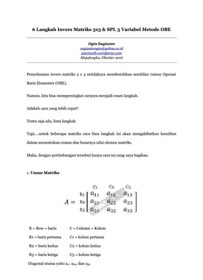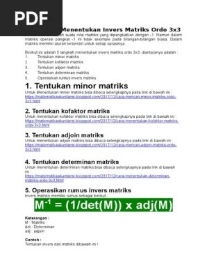 mencari invers matriks berordo 3x3 dapat dilakukan dengan dua cara, yaitu dengan adjoin dan transformasi baris elementer. cara mencari invers matriks ordo 3×3 ~ pada kesempatan ini saya ingin mencoba mengreview kembali bagaimana cara mencari nilai dari matriks yang mempunyai ordo 3×3. Seperti tutorial sebelumnya mengenai operasi aritmatika pada matlab yang membahas skalar, pada tutorial ini membahas matriks sebagai objek utama. Terimakasih semoga ilmu yang di dapat bisa bermanfaat dan berguna. Determinan matriks 3x3 metode sarrus dan minor kofaktor 2nv8e2k5prlk from idoc.pub untuk mencari determinan matriks, ada baiknya kita terlebih dahulu mengetahui definisi dari suatu matriks matematika.